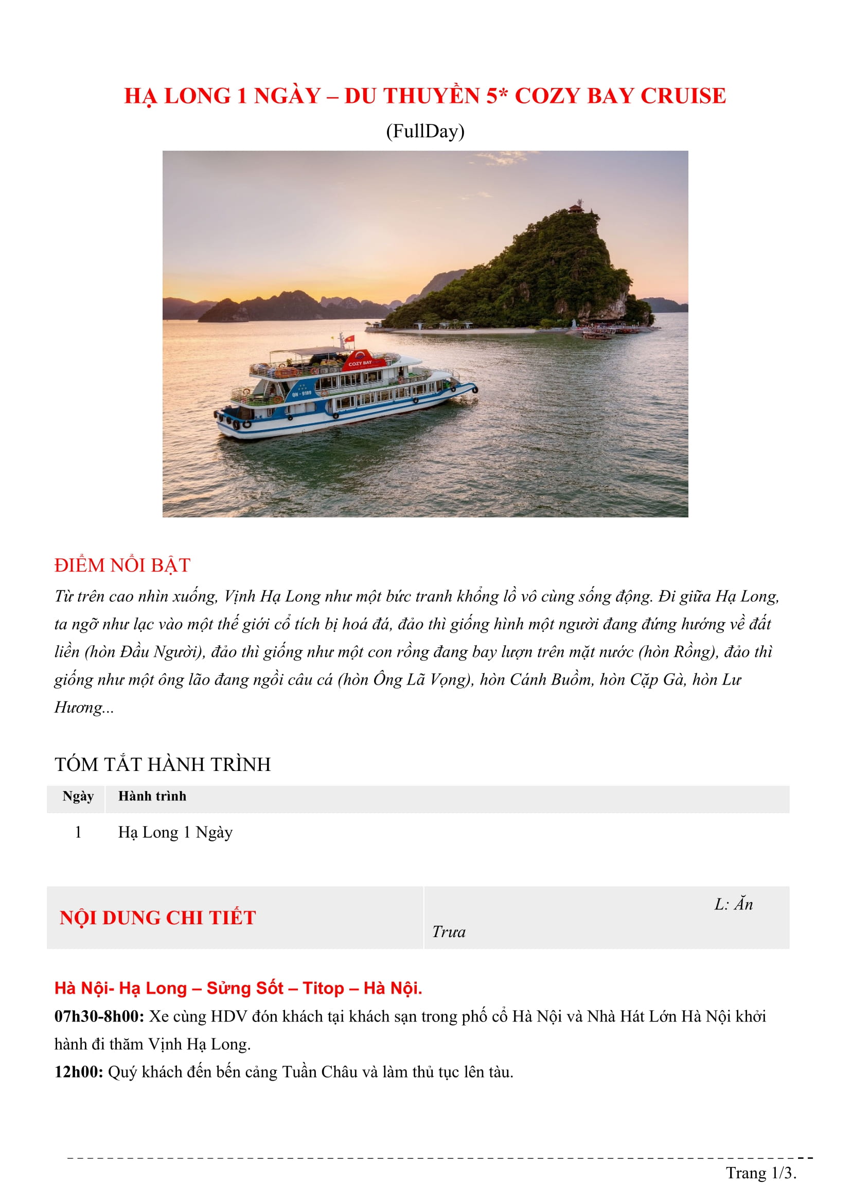 20h30 – 21h00: Về tới Hà Nội, xe đưa Quý khách về lại điểm đón ban đầu. Kết thúc chương trình khám phá Kỳ Quan thiên nhiên thế giới Vịnh Hạ Long trong ngày trên du thuyền Cozy Bay Premium Cruise. Hẹn gặp lại Quý khách!