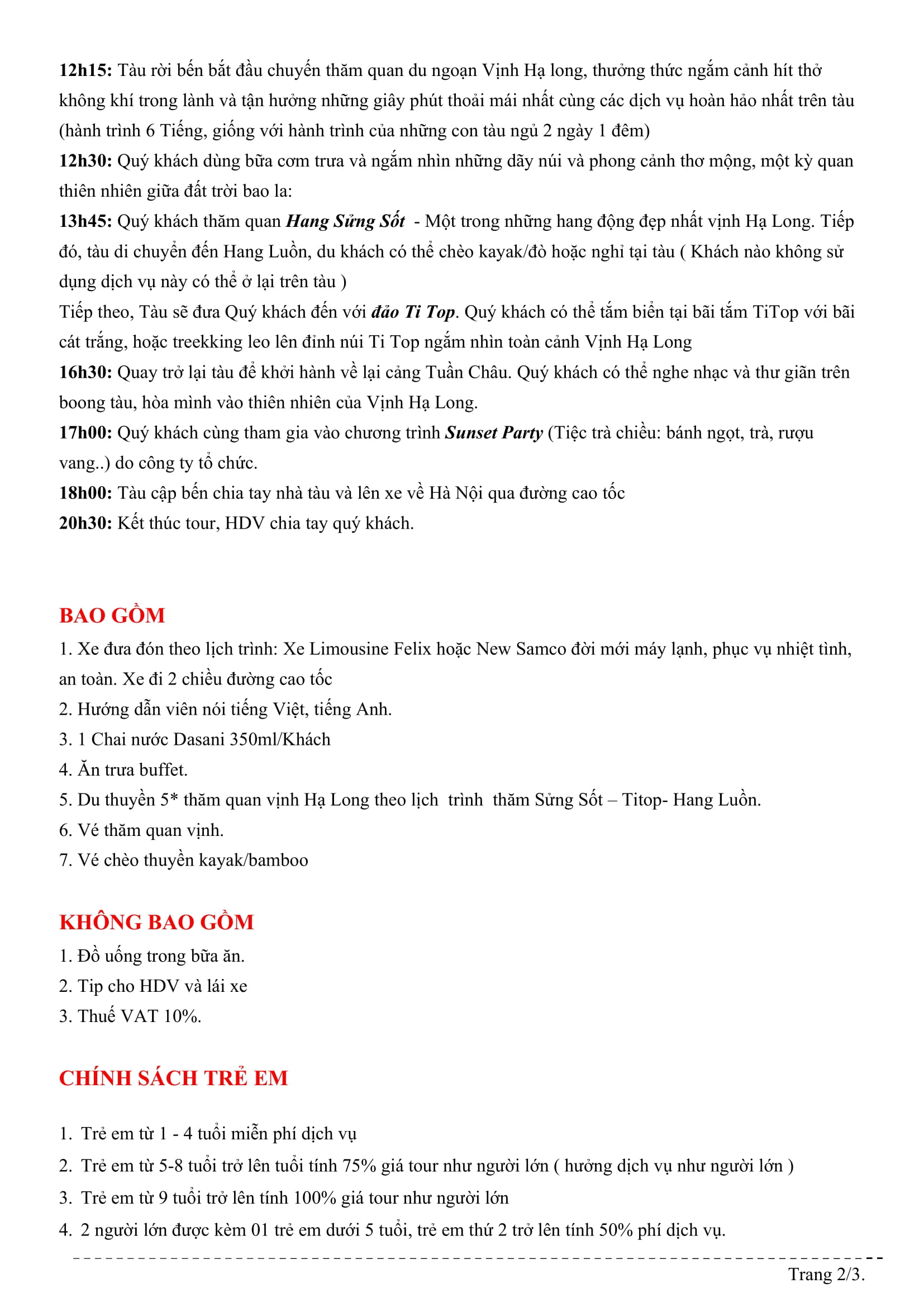 Lưu ý quan trọng: Thời gian đi thăm quan Du Lịch Vịnh Hạ Long có thể được điều chỉnh phù hợp với điều kiện của từng ngày khởi hành hoặc có thể bị thay đổi điều chỉnh phụ thuộc vào thời tiết Hạ Long hoặc sự điều phối của Ban quản lý Vịnh Hạ Long. Trong một số trường hợp có thể có lệnh cấm xuất bến bất chợt do có gió to hoặc mưa giông mà không cần thông báo trước. Mong Quý khách chấp nhận và thông cảm!