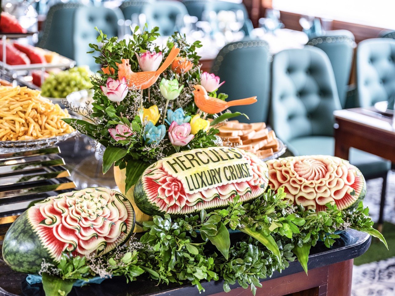 - Bữa ăn trưa buffet cao cấp trên tàu, mang đến cho du khách trải nghiệm độc đáo với ẩm thực Việt Nam giữa lòng di sản.