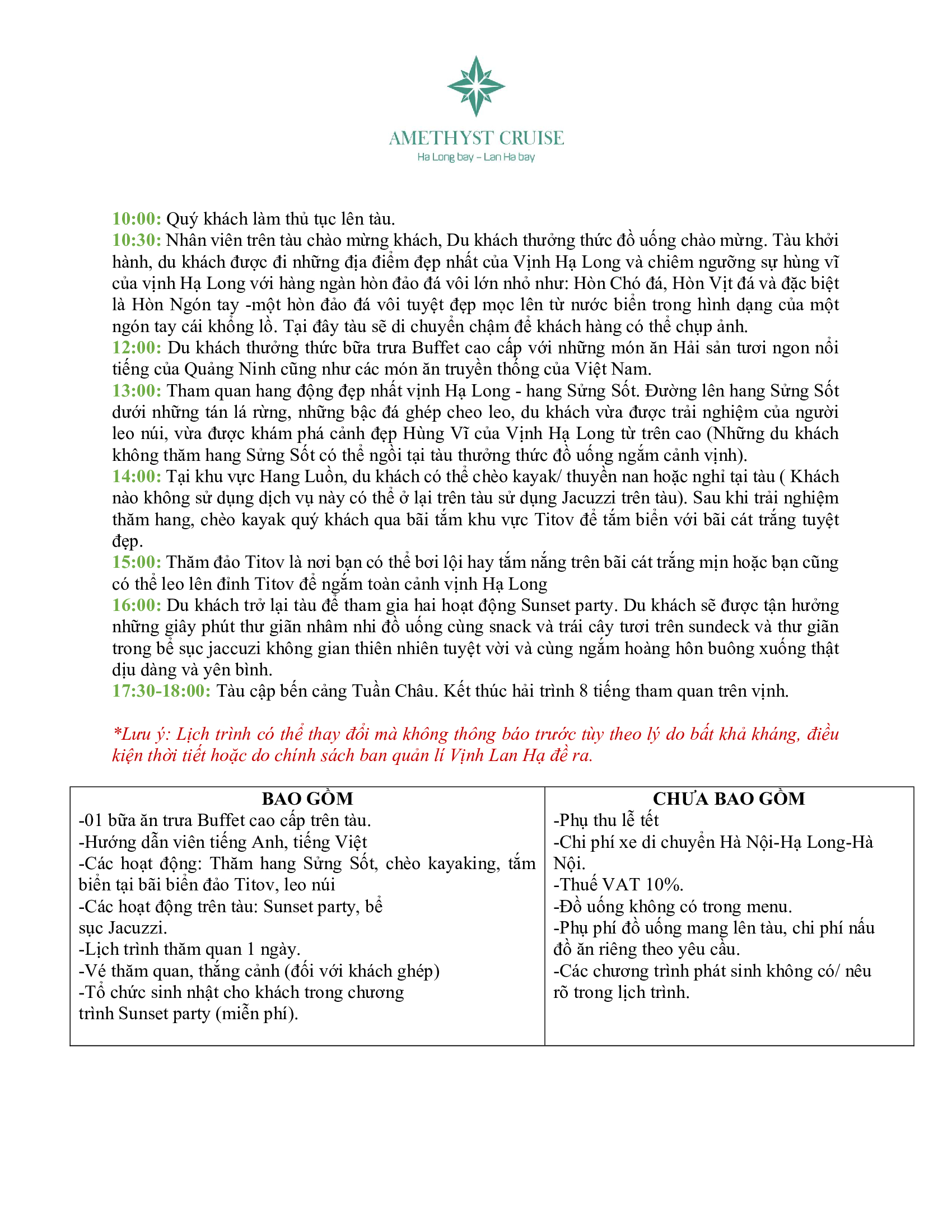 – Lịch trình chạy các tuyến điểm đẹp nhất trên vịnh Hạ Long chỉ gói gọn trong 1 ngày với Amethyst cruise.