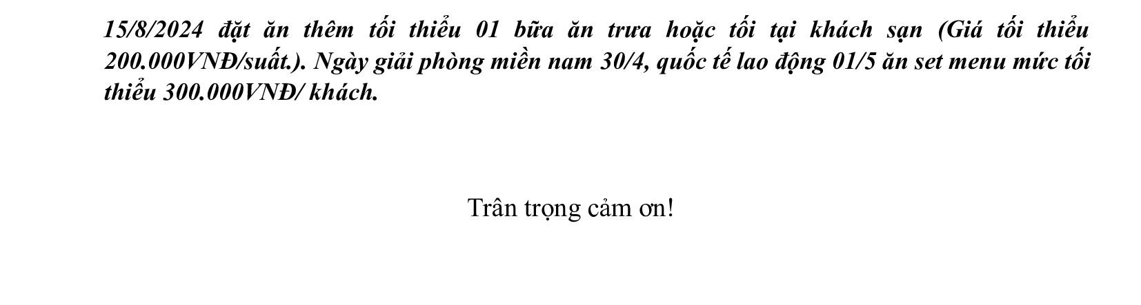 - Thông tin giường phụ thì tùy thuộc vào mỗi phòng. Vui lòng kiểm tra thông tin phòng để biết chi tiết.