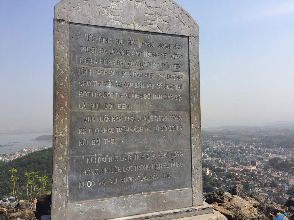 Đêm đêm, lính gác đốt đèn báo hiệu, chỉ đường cho thuyền bè cập bến, khi có giặt thì đột lửa báo tin về kinh đô. Dân gian gọi là núi Dọi Đèn. Mùa xuân năm 1468, vua Lê Thánh Tông đề thơ khắc trên vách đá, từ đó gọi là Núi Bài Thơ. Là di tích của hoạt động thông tin liên lạc trong lịch sử dựng nước và giữ nước của dân tộc.” – trích lời đề từ trên bia đá.